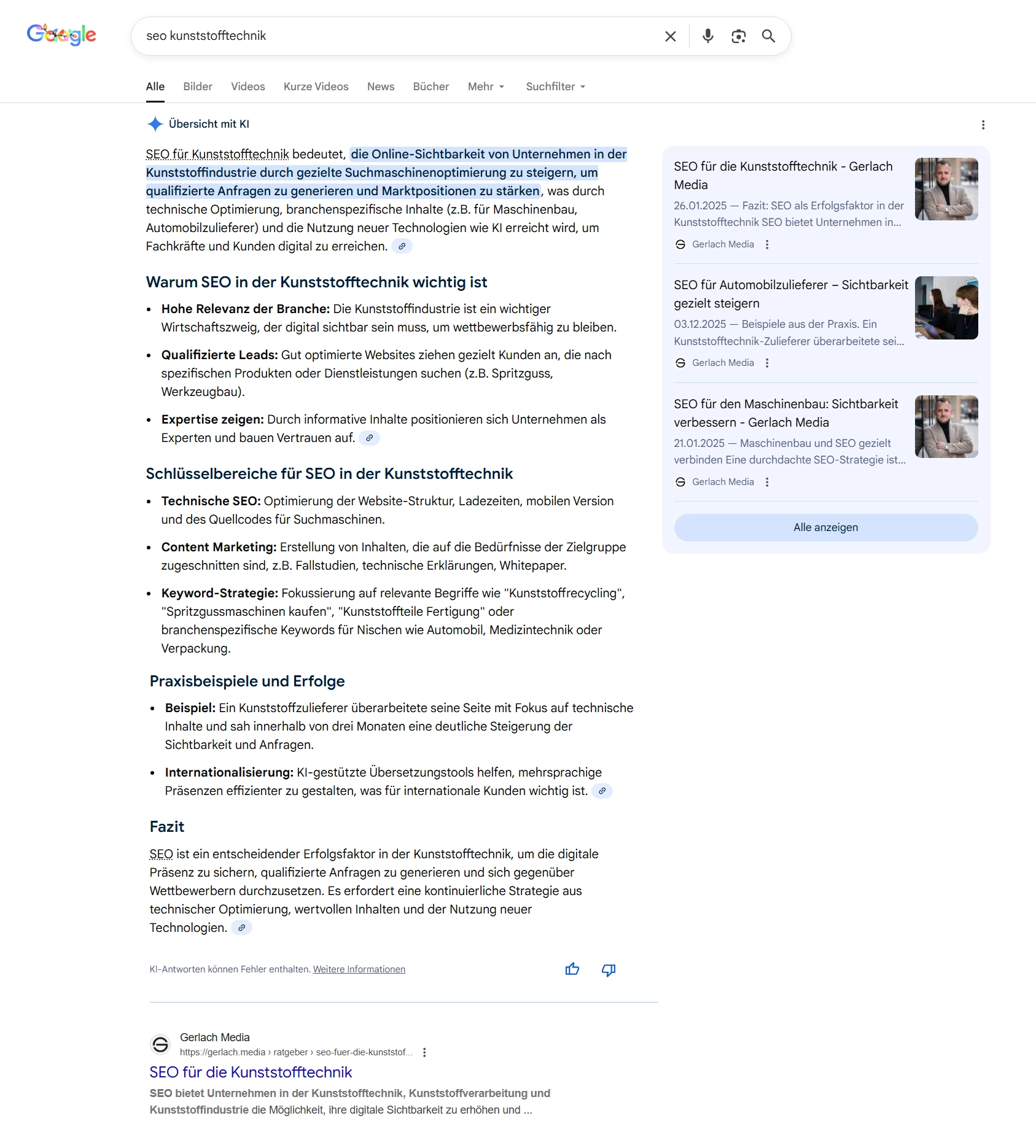 Wie sich diese Prinzipien in der Praxis auswirken, zeigt die Suchanfrage „SEO Kunststofftechnik“.So dominieren Sie die Google Suchergebnisseite (inkl. KI Übersicht)