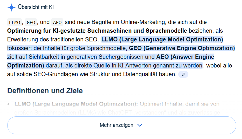 Eine Optimierung speziell für AI Overviews ist technisch möglich, strategisch jedoch zu eng gedacht. GEO ist bewusst weiter gefasst und nicht an ein einzelnes Produkt gebunden.