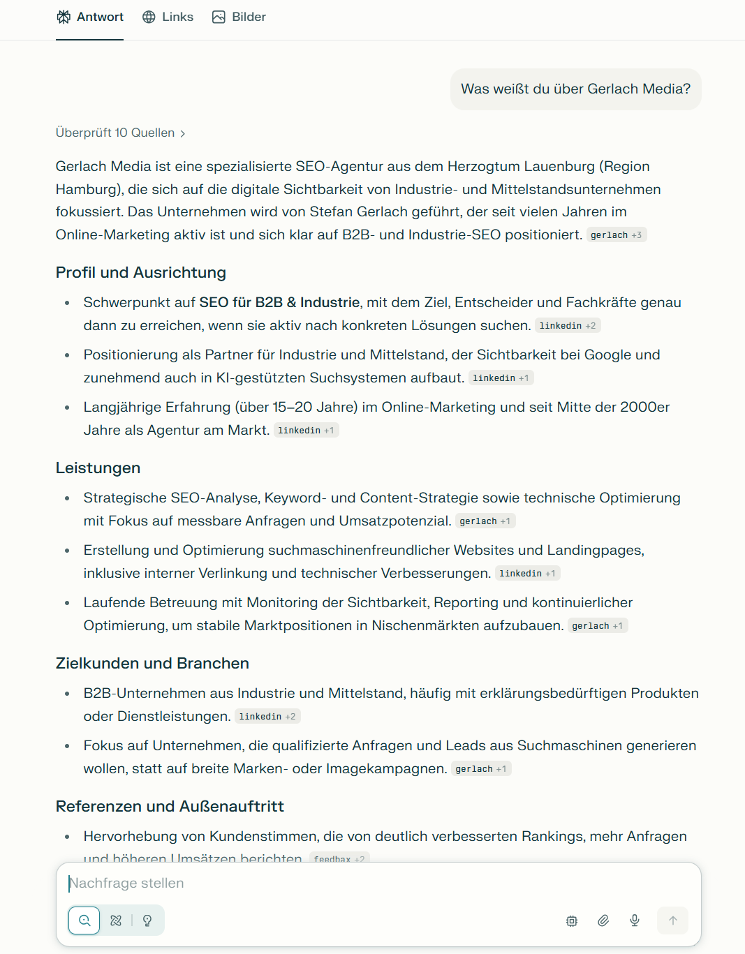 Für die Sichtbarkeit von Unternehmen bedeutet das: Inhalte werden nicht mehr nur gefunden, sondern verwendet. Sie fließen in Antworten ein, dienen als Referenz oder werden indirekt zitiert.