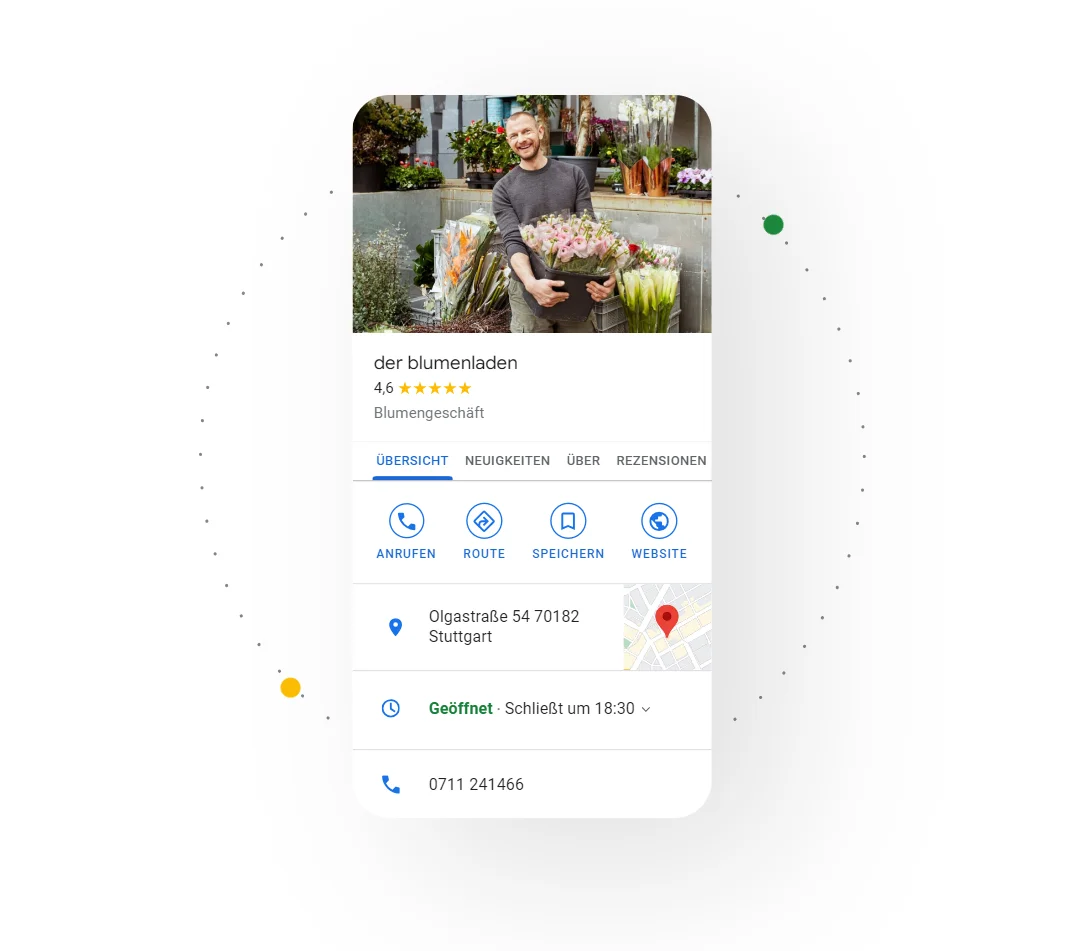 erscheint bei relevanten Suchbegriffen direkt in der Google-Suche und bei Google Maps